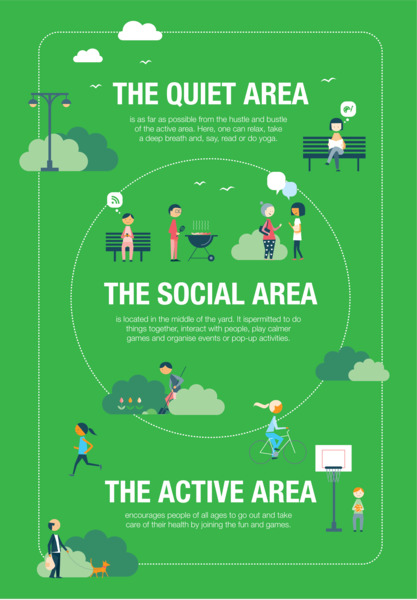 The varying needs of users, naturalness of encounters and cross-generation nature have been strongly taken into account in yard design. In the concept, the physical space of the yard is comprised of three permanent and separate areas which meet the needs of people at each time.