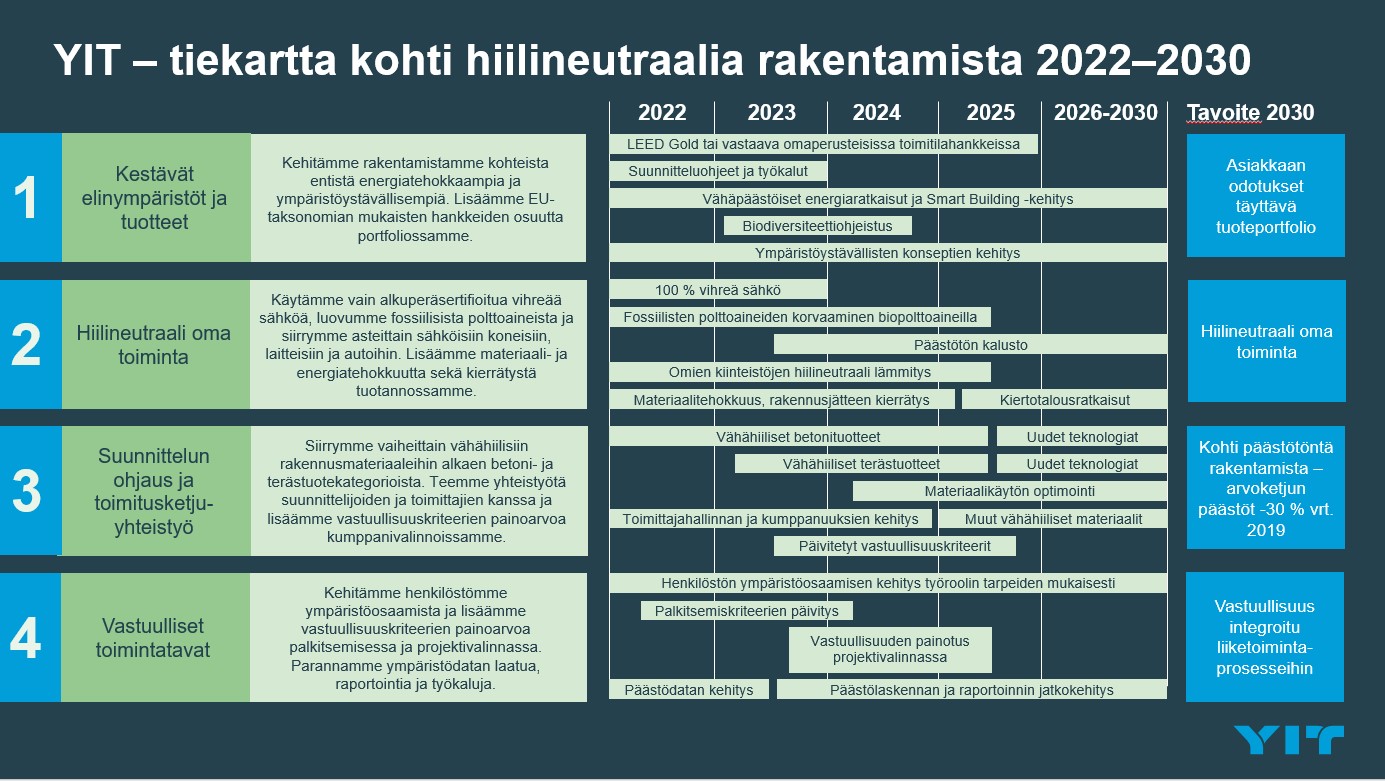 Tieteeseen perustuvien päästövähennystavoitteiden lisäksi YIT:n tavoitteena on olla hiilineutraali omassa toiminnassaan (scope 1 ja 2) vuoteen 2030 mennessä. Tästä päästövähennysten osuus on yli 90 % ja loput päästöistä kompensoidaan luontopohjaisilla, luonnon monimuotoisuutta edistävillä ratkaisuilla.